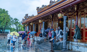 Do ảnh hưởng của không khí lạnh và gió đông trên cao gây mưa lớn, TP Huế sáng nay bị ngập nhiều tuyến đường, 290.000 học sinh phải nghỉ học, nhưng "thời tiết mưa gió không cản trở du khách đến thăm".